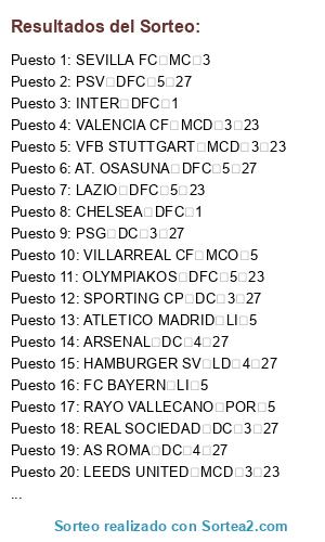 Lista de participantes: FIORENTINA DFC 5 23, LAZIO DFC 5 23, RAYO VALLECANO POR 5, ATLETICO MADRID LI 5, AS ROMA DC 4 27, ARSENAL DC 4 27, INTER DFC 1, FC SCHALKE 04 MD 3 23, FC BAYERN LI 5, SL BENFICA MC 1, VALENCIA CF MCD 3 23, AJAX DFC 5 23, RCD ESPANYOL MD 3 23, MARSEILLE DC 4 27, VFB STUTTGART MCD 3 23, LEEDS UNITED MCD 3 23, CHELSEA DFC 1, REAL SOCIEDAD DC 3 27, OLYMPIAKOS DFC 5 23, PSG DC 3 27, PANATHINAIKOS MCD 5, HAMBURGER SV LD 4 27, GETAFE CF DC 3 23, SEVILLA FC MC 3, AT. OSASUNA DFC 5 27, VILLARREAL CF MCO 5, PSV DFC 5 27, REAL MADRID CF MC 1, SAMPDORIA MI 5 27, SPURS MCD 3 23, SPORTING CP DC 3 27, NEWCASTLE UTD POR 5.