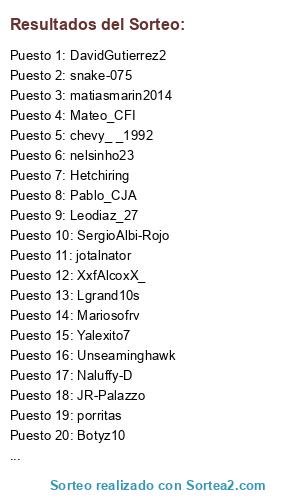 Lista de participantes: chevy_ _1992, Mariosofrv, fricknopa_fcc, camilo0512, Nacional110, X_Juankmfc_X, laujan1218, Garysnakeye, Bogotano18, DavidGutierrez2, Tinchomul, Lgrand10s, Carpal305, nelsinho23, maxxi_27, Juanse_aoki, Pepeasesino1, ElTumiPeru, stikjorJC17, Valcrist, PERUANOFORCE10, davidal1014, Botyz10, Fenomenal1993, onlysantew, Colombiannicko, Mateo_CFI, melendez_marco, Ricawoody14, FF-GERMAN, Jovanny1981, snake-075, snake-0751, Nathan_0223, peselepo, Hetchiring, DECANO_TORRES, Tu-muert3, jotalnator, Cfc_Zlatan, SergioAlbi-Rojo, matiasmarin2014, LM_Mafla_I9I, ironmaneslaond, cristhian_fistks, JAZON10FCB, Leodiaz_27, Axuby, Torettao-CFI, HND _ - Marcos - _ HND, o11ceCaldas, Lcharry79, LeanDami05, The_keane29, Ramagol5, torettoidag, XxfAlcoxX_, JavierOp915, flosanlopez17, adonko, Juanksh1133, Siiriiuus, joZeto_90, Cajf, JulianMB1986, Polaniar, CamiloDiaz6, YSIKSTBN24, JMpIx, Naluffy-D, JR-Palazzo, WillMolinag, Lokombia_27, diegoalvarez12, Andresmesa11, Unseaminghawk, Pablo_CJA, Yalexito7, Fer-Villa105, porritas.