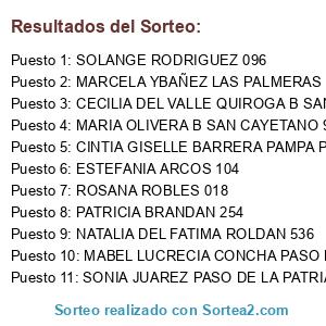 Lista de participantes: YESICA JIMENES PASO DE LA PATRIA 610, NORMA JIMENEZ PASO DE LA PATRIA 828, ALICIA OLIVERA BAJO HONDO 321, DAIANA CONCHA LA FORTUNA 040, SILVA ROSA PASO DE LA PATRIA 771, SANCHEZ CLAUDIA 278, TORASSA EMA 714, SANCHE MARIA NOEMIA BARRIO SUR 470, PORTALE GABRIEL LA FORTUNA 861, MERCEDES ARROYO 616, ROMINA ISABEL GUERRA EL TRIUNFO 971, CELESTE ROLDAN BARRIO CENTRO 278, BLANCA ARANDA BARRIO CENTRO 812, VIRGINIA SIERRA BAJO HONDO 366, CAJAL MARIELA PASO DE LA PATRIA 998, YESICA CONCHA LA FORTUNA 234, CONCHA VANESA LA FORTUNA 294, ROLDAN RAMONA LA FORTUNA 161, CRISTINA JAIMEZ LAS PALMERAS 009, MARIA AZUCENA VALENZUELA LAS PALMERAS 785, ISABEL ORELLANA B SUR 395, CAROLINA GARNICA B SUR 802, KAREN QUIROGA B SUR 318, MARINA ROSARIO DEL VALLE PAVON LA FORTUNA 974, MERCEDES MOLINA DIAZ B SUR 372, MIRTA MEDINA PAMPA POZO 363, MARIA PINILLO LA FORTUNA 876, SOSA GABRIELA 170, FRIAS ELVECIA 957, SOSA FABIOLA 707, SOSA SUSUANA 980, GARCIA LORENA 841, CASTILLO ALICIA PASO DE LA PATRIA 939, LUJAN FLORES 087, RAMONA PEREYRA PASO DE LA PATRIA 971, LILIANA CABRERA LAS PALMERAS 028, NANCI BUSTAMANTE 288, ROSA GARNICA RAMONA LAS PALMERAS 337, VICTORIA GARNICA LAS PALMERAS 778, VALERIA ROLDAN LAS PLAMERAS 172, LOURDES GIMENEZ LAS PLAMERAS 872, TIZIANA JIMENEZ LAS PALMERAS 201, RAMONA PORTALES LA FORTUNA 835, ROSANA ROBLES 018, ANDREA NAVARRO 255, VANESA PEREYRA PASO DE LA PATRIA 526, ADRIANA CORIA B SAN ROQUE 266, SANDRA PEREZ B CENTRO 404, ARGENTINA PEREYRA B SAN ROQUE 144, ARGEMINA SANCHEZ 227, ESTEFANIA ARCOS 104, RAMONA PEREYRA PASO DE LA PATRIA 971, CINTIA GISELLE BARRERA PAMPA POZO 154, ANDREA LAURA BARRERA PAMPA POZO 767, MARTA OFELIA MANSILLA 926, VALERIA NAVARRO B SAN ROQUE 411, MARCELA CORIA B SAN ROQUE 352, MARIA EUGENIA JUAREZ B LAPACHITO 537, MABEL LUCRECIA CONCHA PASO DE LA PATRIA 461, SONIA JUAREZ PASO DE LA PATRIA 463, NAVARRO ANGELA CAROLINA PASO DE LA PATRIA 957, MARTA GARNICA MONTE FLOR 041, CONTRERAS MARTINA DEL JESUS B SUR 259, PATRICIA SOSA B COMPLEJO 826, FRIAS FLORENCIA B SAN ROQUE 327, ESTELA PEREYRA B COMPLEJO 167, GLADIS FRIAS B COMPLEJO 963, ROSA SANTAN B COMPLEJO 600, MARIBEL BUSTAMANTE 300, LUCRECIA PAZ 781, BERTA INES PORTALES LA FORTUNA 567, AYELEN SANCHEZ 178, ROSA ISABEL PORTALES LA FORTUNA 094, NATALIA DEL FATIMA ROLDAN 536, JULIA PINILLO PASO DE LA PATRIA 212, JULIA PAZ B SUR 904, NATALIA PAZ B COMPLEJO 377, CAROLINA PAZ B LAPACHITO476, PEREYRA RAMONA 971, NATALIA PAZ 377, REINAGA ELBA B SUR 914, ALDERETE SILVINA B SUR 161, KARINA BARRERA PAMPA POZO 972, ESTER MEDINA 508, JULIA LAURINDA PEREYRA PASO DE LA PATRIA 891, ALEJANDRA CONCHA LA FORTUNA 014, ZULEMA PAS 981, ZULEMA OLIVERA B SUR 609, NILDA QUIROGA B CENTRO 240, SILVIA QUIROGA B CENTRO 834, REA ANA MARIA PAMPA POZO 327, GUERRA JUANA LILIA PAMPA POZO 335, CELIZ NORA PAMPA POZO 036, CLAUDIA ROCHA B COMPLEJO 466, MARTA FRIAS B COMPLEJO 225, MARIA ELISA IBAÑEZ B SAN ROQUE 301, VERONICA REA 239, MARCELA MOLINA 811, JULIA SONIA BORQUEZ PAMPA POZO 525, OLGA MERCEDES REA PAMPA POZO 868, SOLEDAD ROLDAN LA FORTUNA 997, PRICILA CARO DENEI LA FORTUNA 353, PATRICIA ROLDAN DENEI LA FORTUNA 337, CARINA ROLDAN DENEI 241, ERICA ALZOGARAY B SUR 496, CECILIA B SUR 484, ALDERETE ANDREA 701, CORONEL RAMONA BEATRIZ 052, OLIVERA NELIDA GRACIELA 951, ELIAS LIDIA GRACIELA 500, MARILIN MELIAN MONTE FLOR 709, MARIELA JIMENEZ 810, AGUSTINA RIVAS B LAPACHITO 908, LUISA QUIROGA B SAN CAYETANO 975, SANDRA MOYA B SAN ROQUE 491, EUGENIA MELIAN MONTE FLOR 271, MARIA OLIVERA B SAN CAYETANO 905, ANALIA JUAREZ B SAN CAYETANO 296, LAURA FRIAS PUERTA ALEGRE 473, GUZMAN JUANA SOLEDAD LA RUDA 983, JUANA ROJAS LA FORTUNA 870, RAMONA CONCHA LA FORTUNA 847, SOLEDAD PONCE LA FORTUNA 471, NANCI JUAREZ LA FORTUNA 215, GILDA PEREYRA LA FORTUNA 514, YESICA VALENZUELA LAS PALMERAS 036, ZAIDA FRIAS LAS PALMERAS 967, CORONEL ANGELICA DEL CARMEN 015, MARIA JOSE PAZ PASO DE LA PATRIA 260, VIVIANA AGUERO B SUR 079, ROXANA AGUERO B SAN ROQUE 485, ROCIO IBAÑEZ B COMPLEJO 609, PAZ CAMILA B SUR 355, EVELIN RODRIGUEZ PUERTA ALEGRE 018, SANDRA ALZOGARAY 536, SOLANGE RODRIGUEZ 096, ROSA JULIANA GUERRA PAMPA POZO 850, RIVADENEIRA MARIA 072, MARCELA MOLINA B SUR 716, MANUELA OLIVERA B CENTRO 764, PATRICIA BRANDAN 254, MEDINA MABEL LILIANA LAS PALMERAS 337, SILVIA REA PAMPA POZO 008, LAURA LEDESMA B LAPACHITO 900, LAURA BARRRERA B LAPACHITO 786, ROCIO MARCINI B LAPACHITO 202, ROSA JIMENEZ B CENTRO 699, MIRTA MEDINA 363, CINTIA GISELLE BARRERA PAMPA POZO 154, MARTA ROCHA B COMPLEJO 325, AMELIA SOSA 031, MARCELA YBAÑEZ LAS PALMERAS 469, ROMINA NOELIA CONCHA LA FORTUNA 033, NATIVIDAD RODRIGUEZ B LAPACHITO 344, AURORA PORTAL 922, MONICA PAZ PASO DE LA PATRIA 021, JUAREZ MILAGRO PASO DE LA PATRIA 603, JUAREZ RITA PASO DE LA PATRIA 263, MARIBEL YBAÑEZ B CENTRO 013, NORMA OLIVERA 950, ROJAS MERCEDES B LAPACHITO 249, MARGARITA ALBORNOZ LAS PALMERAS 991, CLAUDIA DIAZ 700, NORA ANAKIN B CENTRO 039, ANTONIA CORONEL EL TRIUNFO 920, TORO FLORENCIA B SAN CAYETANO 735, CARINA ELIAS 051, MOYA BEATRIZ 089, YOHANA SALGUERO B LAPACHITO 642, BARRERA GLORIA LAS PALMERAS 017, TERESA SOSA B SAN MARTIN 262, AGUSTINA RIVAS 908, VICTORIA BARRERA 633, ANTONELA ARISMENDI 736, GRINGA PAZ 999, BEATRIZ PAS 310, ROSA FRIAS 315, MARIA RUIZ B SUR 530, DANIELA MEDINA 674, CARMEN GUANCA 021, CINTIA BARQUET 166, MERCEDES CASTILLO B LAPACHITO 440, LILIANA JAIMEZ B SAN ROQUE 052, DEVORA MEDINA 753, MIRIAN MEDINA 674, CARMEN FLORES B CENTRO, LUCIANA VALENZUELA 003, EMILSE RIVAS 017, MIRIAM CORONEL 024, SILVIA BEATRIZ QUIROGA B SUR 281, SILVIA DEL TRANSITO PEREYRA B SUR 355, CAMILA DEL VALLE PAZ B SUR 941, CECILIA DEL VALLE QUIROGA B SAN CAYETANO 127.