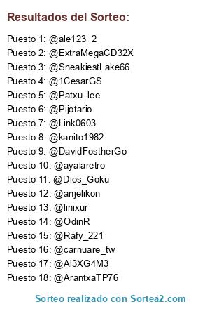 Lista de participantes: @Al3XG4M3 , @Rafy_221, @ExtraMegaCD32X, @OdinR, @SneakiestLake66, @ayalaretro , @linixur , @ale123_2 , @ArantxaTP76, @carnuare_tw , @anjelikon, @Patxu_lee , @kanito1982, @Dios_Goku, @1CesarGS, @Link0603, @DavidFostherGo , @Pijotario.