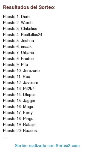 Lista de participantes: Domi, Javixere, Akiramanresa, Wareh, Pingu, Jerezano, Pit2k7, Mago, Dlopez, Joshua, Roc, Rafajim, Pitu, Buades, Boollullos24, Frodeo, Chikelius, Jagger, Ferry, Rofita, imaak, Urbano.