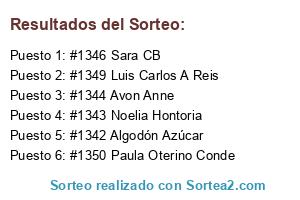 Lista de participantes: #1304 Beatriz Gil, #1305 Lorena Gallardo Martinez, #1310 Rosario GT, #1311 Lorenita Olmo, #1314 Ainhoa Morales, #1316 Claudia Sol, #1318 Ainhoa López, #1320 Marta Rovira, #1322 Lydia Witherspoon, #1324 Liz Medina, #1326 Tania Suárez Seronero, #1330 Miren Nekane Tokero Hernandez, #1336 Jeycee Angulo, #1337 LuLii Alba, #1342 Algodón Azúcar, #1343 Noelia Hontoria, #1344 Avon Anne, #1346 Sara CB, #1349 Luis Carlos A Reis, #1350 Paula Oterino Conde, #1351 Aldana Cugliari, #1352 Sandra Ferrer Guinot, #1353 Sandra Rodríguez Prol, #1354 Novadermia Estètica, #1355 Carmen García Moreno, #1356 Francisco José Sánchez Iñesta, #1357 Javier Sabio, #1358 Javi Salinasa.