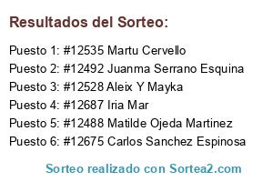 Lista de participantes: #12488 Matilde Ojeda Martinez, #12492 Juanma Serrano Esquina, #12528 Aleix Y Mayka, #12535 Martu Cervello, #12675 Carlos Sanchez Espinosa, #12687 Iria Mar.