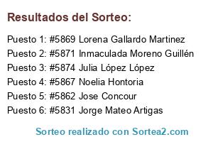 Lista de participantes: #5764 Patricia Pou, #5765 Claudia CR, #5766 Ana Mondejar, #5767 Sara Camara Escudero, #5775 Sandra Ferrer Guinot, #5778 Juan Gemez Mata, #5782 Katerina Knyazhechenko, #5784 Juanfeo Feojj, #5790 Txaro Elena Garcia, #5793 Fanny Freire, #5795 Maria Jose Arriba, #5807 Don Vito Trocolino, #5815 Isa María Martos, #5820 Miguel Sanchez, #5822 Vanessa Espinosa Sanchez, #5823 Iara Blando, #5824 Nati Sáenz, #5827 Virginia Nespereira Picouto, #5831 Jorge Mateo Artigas, #5842 Lorena Gutierrez Lopez, #5844 Raul Mendez, #5857 Raquel Martínez, #5858 Ivan Villamizar, #5862 Jose Concour, #5867 Noelia Hontoria, #5869 Lorena Gallardo Martinez, #5871 Inmaculada Moreno Guillén, #5874 Julia López López, #5878 Liz Medina, #5926 Mary María, #5938 Alberto Martín, #6024 Anna Gascó Marín, #6035 Sharay Martin Arroyo, #6063 Guillermo Jose Manzanares Navarro, #6064 Anaïs Rodriguez Alonso, #6077 Rosa Gladys Guardia Pujol.
