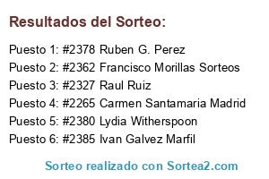 Lista de participantes: #2265 Carmen Santamaria Madrid, #2268 Guillermo Jose Manzanares Navarro, #2270 Claudia Sol, #2271 Francisco Morillas Torres, #2272 Nael Dp, #2273 Lorenita Olmo, #2274 Ainhoa Morales, #2275 Francisco Sánchez, #2276 Lorena Gallardo Martinez, #2277 Cristina Obregon, #2278 Pedro D Ascola, #2279 Vanne Serna Caballero, #2318 Francisco Javier Martinez Llamas, #2327 Raul Ruiz, #2343 Raul Gomez Perez, #2362 Francisco Morillas Sorteos, #2363 Inma Sorteos Sanchez, #2378 Ruben G. Perez, #2380 Lydia Witherspoon, #2385 Ivan Galvez Marfil, #2387 Esteban Rivas Gonzalez, #2388 Víctor Adalid Morales, #2393 Cristina Banzo, #2401 Cora Zambrano, #2407 Pamela Del Carmen Acevedo Echeverria, #2431 Javier Pulido.