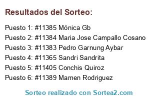 Lista de participantes: #11365 Sandri Sandrita, #11366 Sara Rojo, #11367 Miriam Rodriguez, #11368 Lu Bernabe, #11370 Ana Maria Perez Loren, #11371 Marta Montero, #11372 Sandra Ferrer Guinot, #11373 Alfons Aladreta, #11374 Muxa Morgade, #11376 Isabel Aguilar, #11378 Jorge Escriba Alonso, #11380 Melania Meyers Gomez Pretty, #11382 Pilar Carnicer Corchero, #11383 Pedro Garnung Aybar, #11384 Maria Jose Campallo Cosano, #11385 Mónica Gb, #11388 Lucrecia Sanchez, #11389 Mamen Rodriguez, #11391 Nieves Salas Gil, #11393 Liliana Piccinetti, #11394 Andreea Cabello HC, #11395 Carlos Sanchez Espinosa, #11397 Elina Rojas, #11399 Arantxa Hinojosa Lluch, #11403 Romina Francis Britos VIotti, #11405 Conchis Quiroz.