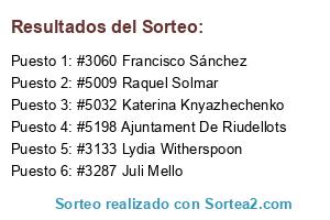 Lista de participantes: #3060 Francisco Sánchez, #3063 Marta Morales López, #3064 Clara Perez, #3069 Lorenita Olmo, #3092 Guillermo Jose Manzanares Navarro, #3133 Lydia Witherspoon, #3287 Juli Mello, #3507 Cris Tina, #4397 Jesús Eduardo Mitchell, #4617 Maribel Godoy Martinez, #5009 Raquel Solmar, #5032 Katerina Knyazhechenko, #5198 Ajuntament De Riudellots, #5233 Ana Isabel Bellon Gomez, #5235 Torpe Dela Red.