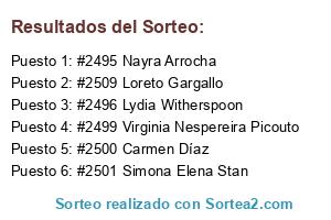 Lista de participantes: #2495 Nayra Arrocha, #2496 Lydia Witherspoon, #2497 Lara Rodríguez, #2499 Virginia Nespereira Picouto, #2500 Carmen Díaz, #2501 Simona Elena Stan, #2507 Magda Nolywajka, #2509 Loreto Gargallo.