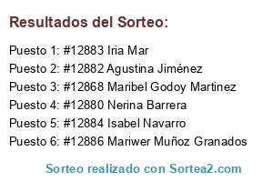 Lista de participantes: #12868 Maribel Godoy Martinez, #12869 Carmen Lozano García, #12870 Katy Garcia Cabrera, #12871 Paqui López, #12872 Maria Jose Pallarés Ruiz, #12873 Nadia Teacherr, #12874 Sonia Cánovas, #12875 Sonia Ibañez, #12876 Silvia Pérez, #12877 Juana María Ruiz García, #12878 Antonio Munuera Mendez, #12879 Judit Claret, #12880 Nerina Barrera, #12881 Cristian Escobar Euceda, #12882 Agustina Jiménez, #12883 Iria Mar, #12884 Isabel Navarro, #12885 Davodaa Casdf, #12886 Mariwer Muñoz Granados, #12887 Carlos Sanchez Espinosa, #12888 Nerea Baztan, #12890 Vanessa Diaz Martinez, #12896 Daniela Polo Bossa, #12898 Sheyla Gomez Julian, #12909 Vallery Holloway, #12910 Maribel Comellas, #12912 Juanjose De Gracia Urban.