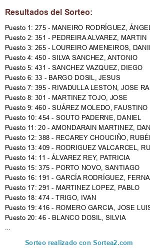 Lista de participantes: 2 - ABEIJON RODRIGUEZ, JOSE ALBERTO, 3 - AGRAFOJO LORENZO, FRANRA, 4 - AGRAFOJO PEREIRA, RAFAEL, 5 - AGRASO POUSO, JOSÉ ANTONIO, 6 - AGRASO TORRES, ALFONSO, 7 - AGULLEIRO, JOSE MIGUEL, 8 - ALCALDE GARCIA, JAVIER, 9 - ALONSO CASTRO, MIGUEL ANGEL, 10 - ALONSO FERNANDEZ, ANTONIO, 11 - ÁLVAREZ REY, PATRICIA, 12 - ALVAREZ VAZQUEZ, JOSÉ ANTONIO, 13 - ALVAREZ VILLAR, ALEJANDRO, 14 - ALVITE GONZALEZ, JUAN ANTONIO, 16 - AMARELLE FERNANDEZ, MANUEL, 19 - AMIGO HUERGA, ROBERTO, 20 - AMONDARAIN MARTINEZ, DANIEL, 21 - AMOR HAZ, MIGUEL, 22 - ANDRADE OTERO, ANDRES, 23 - ANTELO MARTINEZ, JOSÉ RAMÓN, 24 - ARCAY LOUREIRO, ANSELMO, 25 - ARUFE FERNANDEZ, IVAN, 26 - ASTRAY LÓPEZ, ENRIQUE, 27 - ATIENZA MERINO, GERARDO, 28 - BAAMONDE OTERO, ERO, 29 - BALOIRA CARRO, IVAN, 31 - BARCA VARELA, ALEJANDRO, 32 - BARCIA CASTRO, JOSE LUIS, 33 - BARGO DOSIL, JESUS, 34 - BARREAL REQUEJO, DIEGO, 35 - BARREIRO FURELOS, MARCOS (PICAFOLLA), 36 - BARREIRO MOAS, ANGEL, 37 - BARREIRO RODRÍGUEZ, ÓSCAR, 38 - BARROS GARCIA, DIEGO, 39 - BEIRO LESTÓN, DOMINGO, 40 - BEIS SANCHEZ, CARLOS, 41 - BELLO, ALEJANDRO, 42 - BELLO MEIJIDE, FERNANDO, 43 - BENAVIDES PUENTE, ADRIÁN, 44 - BERIAS LAIÑO, LUÍS MIGUEL, 45 - BERNARDEZ FERREIROS, GUSTAVO, 46 - BLANCO DOSIL, SILVIA, 47 - BLANCO LAMAS, MIGUEL, 48 - BLANCO PENSADO, JONATAN, 49 - BLANCO PORTO, JUAN ENRIQUE, 50 - BOTANNA SEOANE, LUIS, 51 - BOUZAS GORGAL, MANUEL, 52 - BOUZAS REY, ISMAEL, 53 - BOUZAS REY, PABLO, 55 - BRENLLA FAJIN, SATIRO, 56 - BUJAN, ÁNGEL, 57 - BUJAN SANTOS, EDUARDO, 58 - BUJAN SANTOS, JOSE MANUEL, 59 - BUSTELO GOMEZ, PABLO, 60 - BUSTO GALLARDO, JOSE MANUEL, 61 - BUSTO LOBATO, MANUEL, 63 - CAAMAÑO, MOISES, 64 - CACHARRÓN ARMENTAL, CARLOS, 65 - CALO PEREZ, MARTIN, 66 - CALVIÑO CARREÑO, JOSE, 67 - CALVO CURRÁS, RAMÓN, 68 - CALVO GARCÍA, TARSI, 69 - CALVO QUINTANS, JOSE MANUEL, 70 - CALVO REY, IVAN, 71 - CALZAS INSUA, DAVID, 72 - CAMEAN CAMEAN, ROBERTO, 73 - CAMIÑO FRAMIL, JOSE ANTONIO, 74 - CAMPOS ALONSO, DIEGO, 76 - CANEL REINO, IVÁN, 77 - CAPINEL SILVA, JOSE ANGEL, 78 - CARBALLEIRO VILAR, SUSO, 79 - CAROU FERNANDEZ, JOSE RAMON, 80 - CAROU MOLEDO, IAGO, 81 - CARREIRA CERNADAS, JOSE IGNACIO, 82 - CARRO CES, RUBEN, 83 - CARRO MAHÍA, ALEJANDRA, 84 - CASAL ANDRADE, DIEGO, 85 - CASAL MOLEDO, ANTIA, 87 - CASAL VAZQUEZ, NACHO, 88 - CASTELLANOS REY, PABLO, 89 - CASTELO VAZQUEZ, JOSE RAMON, 90 - CASTRO ABEIJON, FRANCISCO MANUEL, 91 - CASTRO ABEIJON, JUAN CARLOS, 92 - CASTRO BOUZAS, JORGE, 93 - CASTRO CAAMAÑO, CESAR, 94 - CASTRO CALVO, DAVID, 95 - CASUSO CASTRO, MANUEL, 96 - CELA YAGÜE, JORGE, 97 - CEREIJO LADO, JOSÉ MANUEL, 98 - CESPON BUSTO, SILVIA, 99 - CHOUZA VAZQUEZ, JOSÉ MANUEL, 100 - CORNADO ALCALDE, ROBERTO, 101 - CORRALES VIDAL, JOSE ANTONIO, 102 - COSTOYA RODRIGUEZ, SERGIO, 103 - CRUZ RAMA, JOSÉ ANTONIO, 104 - CUIÑA IGLESIAS, DIEGO, 105 - DE JESUS GONZALEZ, JOSE RAMON, 106 - DE LA FUENTE PEREZ, PAULO, 108 - DIAZ CELADA, ANGEL, 109 - DOMINGUEZ GARCIA, RUBEN, 110 - DOMÍNGUEZ NÚÑEZ, XOSÉ MARIA, 111 - DOMINGUEZ RECAREI, FRANCISCO, 112 - DOMÍNGUEZ VICENTE, ANTONIO JOSE, 114 - DOPAZO MENO, ANGEL, 115 - DOSIL BLANCO, ANTONIO, 116 - DOSIL ROSENDE, PABLO, 117 - EIRÍS ESPAÑA, CARLOS, 118 - ESMORIS CASTIÑEIRAS, RAUL, 119 - ESPARIS SUÁREZ, DIEGO, 120 - ESPASANDIN ROMAR, MANUEL, 121 - ESPERANTE MOLEDO, JOSE, 123 - FABEIRO TEIRA, JOSÉ ANTONIO, 124 - FANDIÑO SANTOS, JORGE, 125 - FERNANDEZ, EDUARDO, 126 - FERNANDEZ, JORGE, 127 - FERNANDEZ ANTELO, FRANCISCO, 128 - FERNANDEZ BELLO, ANDRES, 129 - FERNÁNDEZ BERMEJO, PELAYO, 130 - FERNANDEZ CORZÓN, ALEX, 131 - FERNANDEZ CREO, GUSTAVO, 132 - FERNANDEZ CUTRIN, JOSÉ MANUEL, 133 - FERNANDEZ DURAN, ANTONIO, 134 - FERNANDEZ FERNANDEZ, RUBEN, 135 - FERNANDEZ FORNIS, DAVID, 136 - FERNANDEZ GOMEZ, JOSE FRANCISCO, 137 - FERNANDEZ JUIZ, HUGO, 138 - FERNANDEZ LOJO, AMADOR, 139 - FERNÁNDEZ PAZOS, DIEGO, 140 - FERNANDEZ PEREZ, MARCOS, 141 - FERNANDEZ REY, DESIREE, 142 - FERNÁNDEZ SÁNCHEZ, ISMAEL, 143 - FERNANDEZ SUSAVILA, MARCIAL, 144 - FERNANDEZ VIDAL, ANGEL, 145 - FERRADAS LADO, IVAN, 146 - FERREIRA RODRIGUEZ, ADRIÁN, 147 - FERREIRO FERNANDEZ, ARTURO, 148 - FERREIRO MOLEDO, FRANCISCO, 149 - FERREIROS CREO, SONIA MARIA, 151 - FERRERO QUIÑOY, DAVID, 152 - FERRIN VILLAR, MANUEL, 153 - FIEIRA VILLAR, HECTOR JOSE, 154 - FIGUEIRAS RODRÍGUEZ, MANUEL, 155 - FIGUEIRO CALO, JOSE RAMON, 156 - FIGUEIRO CASTRO, JOSE MANUEL, 158 - FLORES PICHEL, RAÚL, 159 - FOLGAR ROMAY, JAVIER, 160 - FONTAIÑA RODRIGUEZ, JOSE RAMON, 161 - FONTENLA LOPEZ, MARIO, 162 - FORTES OTERO, UXIO, 163 - FRAGA GARCIA, JESUS, 164 - FRAGIO, PABLO, 165 - FRAMIL NEGREIRA, DAVID, 166 - FRANCO AREVALO, MIGUEL ANGEL, 167 - FRANCO MATA, DAVID, 168 - FREIRE LEIS, ROBERTO, 169 - FREIRE LISTA, JOSE MIGUEL, 171 - FRESCO CASTIÑEIRAS, DANIEL, 172 - FUENTES BLANCO, ESTHER, 173 - GALLARDO BLANCO, SERGIO, 174 - GALLARDO LAGO, ALFONSO, 175 - GAMALLO SANCHEZ, MANUEL, 176 - GÁNDARA LEMA, PERFECTO, 177 - GANDARELA FDEZ, JAVI, 178 - GARABAL MOREIRA, ADRIANO, 179 - GARABAL NIETO, JAVIER, 180 - GARCIA, RAMÓN, 181 - GARCIA COUSO, JOSE LUIS, 182 - GARCÍA FERRO, CHEMA, 183 - GARCÍA GESTO, JOSÉ, 184 - GARCIA GUDE, JAVIER, 185 - GARCIA IGLESIAS, RAUL, 186 - GARCIA MARTINEZ, HUGO, 187 - GARCIA PEREZ, MANUEL RAMON, 188 - GARCÍA PINAL, ANÍBAL, 189 - GARCIA RECAREY, DANIEL, 190 - GARCIA REY, JUAN CARLOS, 191 - GARCÍA RODRÍGUEZ, FERNANDO, 192 - GARCÍA ROMERO, JOSÉ MANUEL, 193 - GARCÍA SANDIÁS, CARLOS, 194 - GARCIA TUÑEZ, OSCAR, 195 - GARCÍA VIDAL, FRANCISCO JAVIER, 196 - GOMEZ BREA, JUAN CARLOS, 197 - GOMEZ CAAMAÑO, ANTONIO, 198 - GOMEZ DOMINGUEZ, CARLOS, 199 - GÓMEZ FIGUEIRA, RODRIGO, 200 - GOMEZ LEDE, JESUS, 201 - GOMEZ MATO, JAVIER, 202 - GOMEZ MATO, MARCO ANTONIO, 203 - GOMEZ MATO, RAMON, 204 - GÓMEZ SANTOS, JUAN M., 205 - GOMEZ VARELA, DAVID, 206 - GONZÁLEZ ARES, RAMÓN, 207 - GONZÁLEZ CANLE, JOSÉ MANUEL, 208 - GONZALEZ DOMINGUEZ, FCO JAVIER, 209 - GONZALEZ ESPAÑA, EDUARDO, 210 - GONZALEZ GARCIA, MIGUEL, 211 - GONZÁLEZ LAIÑO, RAMÓ