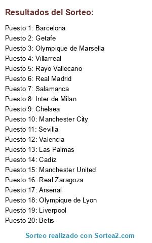 Lista de participantes: Salamanca, Betis, Arsenal, Cadiz, Real Zaragoza, Inter de Milan, Sevilla, Olympique de Lyon, Valencia, Getafe, Manchester City, Las Palmas, Liverpool, Barcelona, Chelsea, Manchester United, Olympique de Marsella, Villarreal, Rayo Vallecano, Real Madrid.