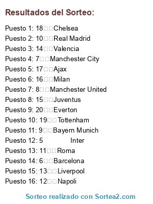 Lista de participantes: 5 Inter, 6 Barcelona, 7 Manchester City, 8 Manchester United, 9 Bayern Munich, 10 Real Madrid, 11 Roma, 12 Napoli, 13 Liverpool, 14 Valencia, 15 Juventus, 16 Milan, 17 Ajax, 18 Chelsea, 19 Tottenham, 20 Everton.