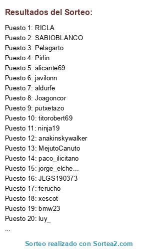 Lista de participantes: jorge_elche..., Pirlin, paco_ilicitano, RICLA, putxetazo, marcos06, bmw23, javivilinares, javi.peque, Byroncete, luy_, Real-Sociedad, opaalvaro, xescot, Joagoncor, lebassI, titorobert69, fpmartin, rojiblanko, LP_6, aldurfe, JLGS190373, inauski, SABIOBLANCO, mode21161, anakinskywalker, ninja19, MaxReebo, javilonn, ferucho, DeaLeR_78, stevemac, MejutoCanuto, ---zumbon, Pelagarto, alicante69.