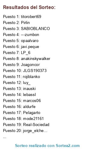 Lista de participantes: bmw23, LP_6, alicante69, opaalvaro, paco_ilicitano, putxetazo, Pirlin, ---zumbon, Joagoncor, anakinskywalker, titorobert69, Real-Sociedad, Pelagarto, javi.peque, javilonn, xescot, mode21161, javivilinares, aldurfe, rojiblanko, jorge_elche..., marcos06, RICLA, JLGS190373, ninja19, ferucho, stevemac, fpmartin, DeaLeR_78, MaxReebo, luy_, MejutoCanuto, Byroncete, lebassI, SABIOBLANCO, inauski.