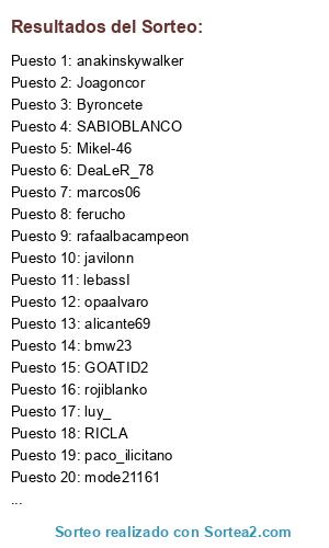 Lista de participantes: fpmartin, ninja19, lebassI, Pirlin, javilonn, RICLA, aldurfe, ferucho, Byroncete, javivilinares, inauski, titorobert69, Joagoncor, paco_ilicitano, opaalvaro, xescot, rafaalbacampeon, choses, alicante69, rojiblanko, luy_, LP_6, mode21161, bmw23, putxetazo, javi.peque, GOATID2, JOSCARGAR, marcos06, Real-Sociedad, DeaLeR_78, ---zumbon, MejutoCanuto, anakinskywalker, chiquitin069, Mikel-46, stevemac, JLGS190373, jorge_elche..., SABIOBLANCO, MaxReebo, Pelagarto.