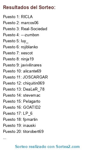 Lista de participantes: javivilinares, ninja19, fpmartin, RICLA, Pirlin, javilonn, ---zumbon, choses, chiquitin069, mode21161, Joagoncor, ferucho, luy_, JOSCARGAR, lebassI, paco_ilicitano, xescot, opaalvaro, bmw23, inauski, alicante69, rafaalbacampeon, Real-Sociedad, marcos06, putxetazo, javi.peque, Pelagarto, GOATID2, anakinskywalker, rojiblanko, titorobert69, DeaLeR_78, aldurfe, LP_6, Byroncete, MejutoCanuto, MaxReebo, stevemac, SABIOBLANCO, JLGS190373, Mikel-46, jorge_elche....