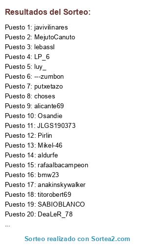 Lista de participantes: bmw23, ninja19, Mikel-46, marcos06, Byroncete, Real-Sociedad, Pelagarto, javilonn, titorobert69, paco_ilicitano, RICLA, luy_, ---zumbon, putxetazo, anakinskywalker, Osandie, chiquitin069, DeaLeR_78, javivilinares, LP_6, jorge_elche..., MejutoCanuto, JOSCARGAR, choses, inauski, SABIOBLANCO, fpmartin, Pirlin, JLGS190373, opaalvaro, aldurfe, javi.peque, GOATID2, rafaalbacampeon, MaxReebo, Joagoncor, xescot, rojiblanko, lebassI, alicante69, ferucho, stevemac.