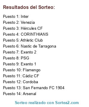 Lista de participantes: Athletic Club, Flamengo, Arsenal, Venezia, CORINTHIANS, Cádiz CF, Nastic de Tarragona, PSG, Hércules CF, Inter, San Fernando FC 1904, Cordoba, Exento 1, Exento 2.