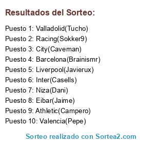 Lista de participantes: Athletic(Campero), Inter(Casells), City(Caveman), Barcelona(Brainismr), Eibar(Jaime), Liverpool(Javierux), Racing(Sokker9), Niza(Dani), Valladolid(Tucho), Valencia(Pepe).