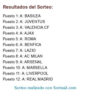 Lista de participantes: A: BENFICA, A: ROMA, A: AJAX, A: REAL MADRID, A: AC MILAN, A: VALENCIA CF, A: ARSENAL, A: JUVENTUS, A: MARSELLA, A: LIVERPOOL, A: LAZIO, A: BASILEA.
