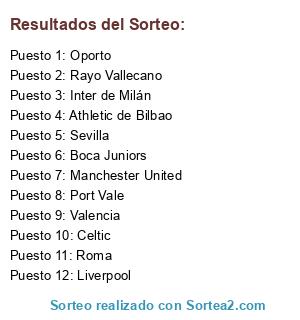 Lista de participantes: Port Vale, Rayo Vallecano, Manchester United, Celtic, Inter de Milán, Athletic de Bilbao, Oporto, Boca Juniors, Sevilla, Roma, Liverpool, Valencia.
