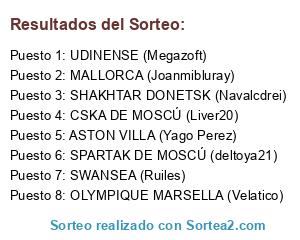 Lista de participantes: OLYMPIQUE MARSELLA (Velatico), UDINENSE (Megazoft), SHAKHTAR DONETSK (Navalcdrei), SWANSEA (Ruiles), MALLORCA (Joanmibluray), SPARTAK DE MOSCÚ (deltoya21), CSKA DE MOSCÚ (Liver20), ASTON VILLA (Yago Perez).