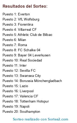 Lista de participantes: Southampton, Swansea City, Fiorentina, Everton, Borussia Mönchengladbach, Tottenham Hotspur, Real Sociedad, Milan, Bayer 04 Leverkusen, FC Schalke 04, Villarreal CF, Lazio, VfL Wolfsburg, Athletic Club de Bilbao, Napoli, Inter, Valencia CF, Sevilla FC, Liverpool, Roma.