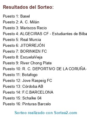 Lista de participantes: Bayern de Múnich, Tiki Taka, SEV7LLA FC, Percebesa, Real Murcia, Real VillaVardy, Schalke 04, Beniel f.c, Atlético de Madrid, Chievo Verona, P S G yes come on, ALGECIRAS CF, Basauri celta team, Las Urracas Black, Pinturas Barcelo, ADN Futbol, Jove Raspeig FC, Estudiantes de Bilbao, Córdoba AB, Inter De Monterrey, EscuelaVieja, Ajax de Amsterdam, Manchester unite, Málaga AB, Olimpic de lyon, Easo United, River ??Plátano??, REAL MADRID, Athletic Arsenal de Mallorca, Fenerbahçe o Escandalo, sl Benfica, FC.BARCELONA.