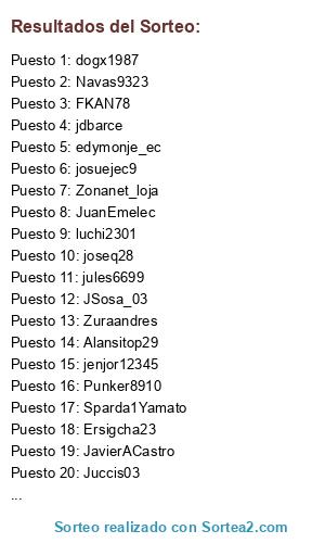 Lista de participantes: edymonje_ec, FKAN78, JuanEmelec, luchi2301, Exorcista12ec, josuejec9, jenjor12345, andres21094, JavierACastro, Punker8910, SACV19996, dogx1987, joseq28, jules6699, Zuraandres, jdbarce, Sparda1Yamato, Zonanet_loja, GOTG_2002, JSosa_03, Ersigcha23, Navas9323, Alansitop29, Juccis03.