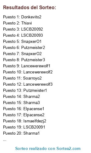 Lista de participantes: Soarroyo1, Soarroyo2, Lancewerewolf1, Lancewerewolf2, Lancewerewolf3, SnapxerO1, SnapxerO2, SnapxerO3, Ismaelfdezj1, Ismaelfdezj2, Ismaelfdezj3, Thiavi, Sharma1, Sharma3, Sharma2, Putzmeister1, Putzmeister2, Putzmeister3, Elpacense1, Elpacense2, Donkevito1, Donkevito2, Damacu, LSCB20091, LSCB20092, LSCB20093.