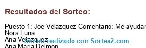 - Ganador: Joe Velazquez Comentario: Me ayudan a darle like Nora Luna Ana Velazquez Ana Maria Delmon Elizabeth Velazquez Juan Alberto Narvaez Juan Ortiz Nayeli SC Armando Reyes Calzadita Charly Juanillo Faby Hernandez Lucero Torres Analy Ramos Carlos Talavera Jessica M. Enriquez Yos Pérez Chuy Salinas Guadalupe Angeles Diana Ramos Letty Cortés Frida SY