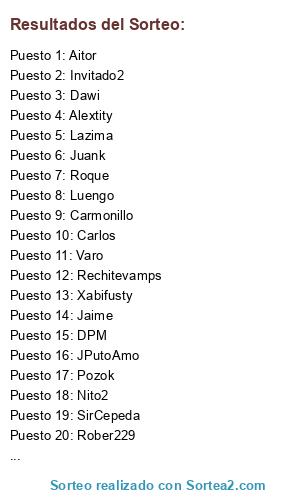 Lista de participantes: DavidG, Itachi, Juampe, Invitado2, Iker, Pozok, JPutoAmo, Meman, Luengo, Carmonillo, Carlos, Rechitevamps, Dawi, Jaime, Danieltog, Alextity, Roque, Xabifusty, Varo, DPM, Céltico, SirCepeda, Souljaboy, Aitor, Lazima, Rober229, Lubin, Nito, Nito2, Juank, Rodri, Invitado.