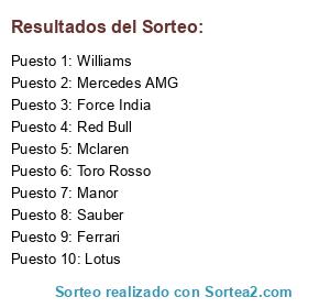 Lista de participantes: Mercedes AMG, Ferrari, Red Bull, Williams, Force India, Toro Rosso, Sauber, Lotus, Mclaren, Manor.