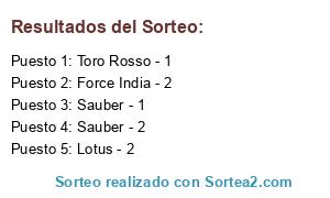Lista de participantes: Ferrari - 1, Ferrari - 2, Lotus - 1, Lotus - 2, Force India - 1, Force India - 2, Sauber - 1, Sauber - 2, Toro Rosso - 1, Toro Rosso - 2.