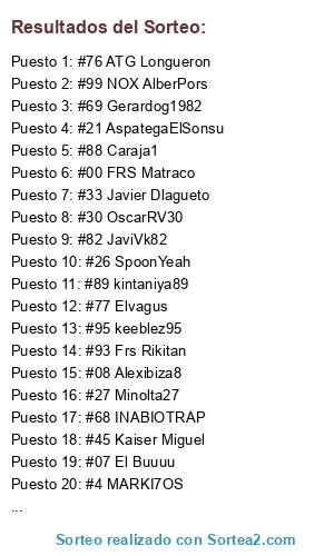 Lista de participantes: #07 El Buuuu, #42 RoberAstur, #82 JaviVk82, #14 Toneti21, #88 Caraja1, #33 Javier Dlagueto, #99 NOX AlberPors, #77 Elvagus, #27 Minolta27, #30 OscarRV30, #95 keeblez95, #17 raulnoelia17, #08 Alexibiza8, #21 AspategaElSonsu, #26 SpoonYeah, #69 Gerardog1982, #4 MARKI7OS, #76 ATG Longueron, #45 Kaiser Miguel, #93 Frs Rikitan, #00 FRS Matraco, #89 kintaniya89, #68 INABIOTRAP.