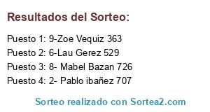 Lista de participantes: 1-Melisa Jauregui 639, 2- Pablo ibañez 707, 3- Jairo caleb reinaga 736, 4- Veronica cuellar 944, 5- Mayra segovia 328, 6-Lau Gerez 529, 7-Sergio Lamas 922, 8- Mabel Bazan 726, 9-Zoe Vequiz 363, 10-Luciana Contreras 961, 11-Pato Rivero 173.