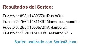 Lista de participantes: 1 55532 rocipoter -, 2 56541 vaneviro -, 3 57233 Silviadp -, 4 98140 ruthpr242 -(2 participaciones), 5 99251 Lourdesrr -, 6 123063 xirispatricia -, 7 389510 fisiomamen -, 8 620109 Juliaap -, 9 664793 Sarams -, 10 666793 LeonorArtacho -, 11 687520 lachari13 -, 12 697218 YOLANDACUHE -, 13 725477 deliaovidiu -, 14 766713 nmartinez2014 -, 15 771578 laps -, 16 781989 abjr -, 17 788627 marverbo -, 18 793124 taniapez -, 19 794618 Sawyer -, 20 794855 ELISAP -, 21 794955 meriquey -, 22 796785 vanesdel -, 23 799900 morenaza84_84 -, 24 800320 MariaI31 -, 25 801074 Irinar -, 26 801749 mireyabcn -, 27 808823 Lauragoce -, 28 809913 Rita Martel Ortega -, 29 818123 Silvya27 -, 30 818846 PAQUIFRAN -, 31 819133 larimba -, 32 822930 Rakel Gracia -, 33 824090 Brujilla7774 -, 34 824368 nelaicha -, 35 825802 estercarla -, 36 833958 la pelotita -, 37 837358 loreabel -, 38 838276 lamage -, 39 840846 ifigueiras -, 40 844746 saraymigue -, 41 846492 teitor -, 42 847805 raquelazogil -, 43 851583 PROFE82 -, 44 855611 Andreea24 -, 45 860992 anelcape -, 46 862561 samaneta -, 47 866774 shirleyzc -, 48 866786 gingi81 -, 49 867395 Javico -, 50 872082 Tigrebimba -, 51 875083 mly -, 52 876181 vaneva82 -, 53 881371 PaulaSanz -, 54 881698 soryss -, 55 882297 Marlioz -, 56 886466 Danicat -, 57 890898 laurymarbana -, 58 891212 Laura E.B. -, 59 903549 quinita86 -, 60 905879 Aliaas -, 61 919711 Terell -, 62 926015 Noah2016 -, 63 937091 JuliaeIria -, 64 937443 fernanda84 -, 65 942231 ixipichi -, 66 943865 Lishec -, 67 949991 PilicaZM -, 68 950120 MERCHESANZGONZALEZ -, 69 954925 sami260489 -, 70 958142 inma4685 -, 71 964503 alexram -, 72 967464 Laurel28 -, 73 971391 myrizur -, 74 980172 Tamiytom -, 75 984119 Sann_brb -, 76 986046 malole21 -, 77 986866 Pizpi79 -, 78 994491 darzee15 -, 79 1000569 gorettis -, 80 1005798 inma21marzo -, 81 1007848 CrisForTei -, 82 1011733 Eva_77 -, 83 1012632 mayy82 -, 84 1014049 Bloal -, 85 1014999 maydaybf -, 86 1023502 Esthersantiago -, 87 1029386 Cede lopez -, 88 1030371 Jess89 -, 89 1046628 Ablg -, 90 1046914 MamenRZ -, 91 1047266 Willma77 -, 92 1048756 Rebek34 -, 93 1049154 miriamyelena -(3 participaciones), 94 1051107 Sarceb -, 95 1056408 clarablancom1 -, 96 1064388 martapf -, 97 1065489 Idoia80 -, 98 1075848 CrisPetaKP -, 99 1077279 Mar7Mar -, 100 1078993 croquetiyad -, 101 1080007 loremoratalla -, 102 1080778 tresamigas -, 103 1081626 zairaycarlos1 -, 104 1083262 Carolina&claudia -, 105 1085354 Mónica y Josep -, 106 1086381 Ana-Dalila -, 107 1087062 erica86 -, 108 1090353 mariroma -(2 participaciones), 109 1091907 solyluna1501 -, 110 1095384 INMA punzon -, 111 1103348 sqm -, 112 1104249 monikanika -, 113 1104563 Marisa9271 -, 114 1113381 mirorgar -, 115 1120297 Ali8 -, 116 1124097 RuthEsc -, 117 1125102 Debii23 -, 118 1126407 ABC81 -, 119 1126902 marta23gomez -(3 participaciones), 120 1127101 Elitovega -, 121 1128619 Elseta -, 122 1132098 MamoiPapoi -(3 participaciones), 123 1139484 sonia aldea -, 124 1141342 Espe0027 -, 125 1143219 Evelyn8910 -, 126 1143551 Bta -, 127 1144558 Meritxell1591 -(2 participaciones), 128 1144644 carmendu -, 129 1150372 Moco81 -, 130 1151312 Cpr33 -, 131 1157301 Magdalenaortega -, 132 1160228 paquimargarita -, 133 1160796 Aicope -, 134 1169157 LadyAnime21 -, 135 1170949 Lluciap -, 136 1172441 airamcjn -, 137 1172589 Nika1986 -, 138 1174288 Mjnyal -, 139 1175224 ireneibañez -, 140 1177936 Analiainfanzon -, 141 1180587 Anais25 -, 142 1182272 AndreeaB. -(3 participaciones), 143 1182326 Veronik80 -, 144 1183348 Ester14 -, 145 1184058 jigasandri -, 146 1193768 mamiwhy -, 147 1194972 Oleksandra13 -, 148 1195012 dyana_morenyta -(2 participaciones), 149 1199667 MirelaM -, 150 1201824 Aran__ -(2 participaciones), 151 1204422 Silvanica1309 -, 152 1208827 Crisvy -, 153 1211293 noeh8 -, 154 1215329 Patalger -, 155 1215568 mirimemo -, 156 1217234 OlallitaPG -, 157 1221176 Yennia -, 158 1221212 sofiwanchi -, 159 1221759 esein -, 160 1224367 soniaamcr -, 161 1232694 lorepeig10 -, 162 1236797 Hp -, 163 1239674 Ice cam -, 164 1240249 Randa -, 165 1242657 clairefh -(2 participaciones), 166 1242784 Fanny235 -, 167 1243618 lila_25m -, 168 1243829 azofaifa -, 169 1244584 Belhy -, 170 1244648 Lust -, 171 1244697 sillita27 -, 172 1246482 Martavillalba -, 173 1246962 CarolyBianca -, 174 1247537 Rakelpg88 -, 175 1247829 Nurymorena -, 176 1248327 saniru -, 177 1250378 Babyquel -, 178 1250707 Geles y Zeus -, 179 1251364 marlenecosta -, 180 1251602 A.J.N -, 181 1252839 Ariakana -, 182 1253511 Liaflix -, 183 1253706 Andreafm -, 184 1253742 alicia.merino89 -, 185 1255832 mjgargu -, 186 1256463 ainana -, 187 1257486 KAngiePg -, 188 1262229 nagolita -, 189 1262347 Mawi984 -, 190 1263127 Jenrosegold -, 191 1263268 Inma Lopez-Laguna -, 192 1264166 Vanesoya -, 193 1264977 Aarnaiz -, 194 1265829 ansoneta -, 195 1266421 GAITY -, 196 1266498 Marina2011 -, 197 1268532 Isabelramo -, 198 1270798 cresida -, 199 1271093 marroneta -, 200 1273989 meletea -(2 participaciones), 201 1275876 Miminionyyo -, 202 1281366 Vanef7 -, 203 1281489 Sus78 -, 204 1282916 diany0811 -, 205 1283144 koxita -, 206 1289836 Onilla -(2 participaciones), 207 1291056 mvicky05 -, 208 1291479 sofi16 -, 209 1292489 Bettyso -, 210 1294001 Silviayjuan -, 211 1294069 ts_tania -, 212 1295033 Jessy2906 -, 213 1295921 Irutxeta -, 214 1300137 LYN2010 -, 215 1303374 MARIBELABU -, 216 1303423 Dianirivas -, 217 1303468 maridita35 -, 218 1303798 Nicole2 -, 219 1304159 pilar1987 -, 220 1304294 Chris13 -, 221 1306084 Scars04 -, 222 1308161 EFV1982 -, 223 1308458 Sonia4 -, 224 1308472 La nati -, 225 1309026 pmarqma -, 226 1309731 Leo30 -, 227 1310937 Ana Benito -, 228 1312637 Menchux -, 229 1314408 Chiflillas -, 230 1314546 Ruth Palomares -, 231 1314917 Monicabeti -, 232 1315979 LENI82 -, 233 1318723 AnayAlexisyAlex -, 234 1319636 krmnmf1305 -, 235 1320298 Rakiel81 -(2 participaciones), 236 1322189 Lisis007 -, 237 1324818 Nati Torrado -, 238 1326443 Saltinpanky -, 239 1326573 Paty1001 -, 240 1326696 Alba bc -, 241 1328177 car