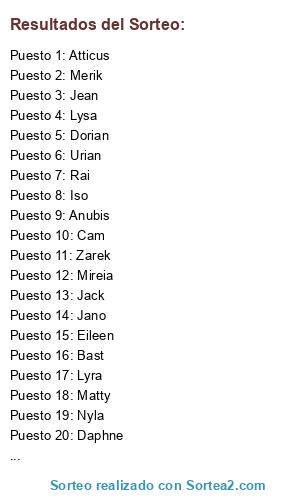 Lista de participantes: Dorian, Jack, Eileen, Bast, Aisha, Zarek, Lysa, Cam, Jano, Jean, Daphne, Urian, Irina, Matty, Lyra, Merik, Rai, Derain, Anubis, Mireia, Atticus, Nyla, Iso, Siv.