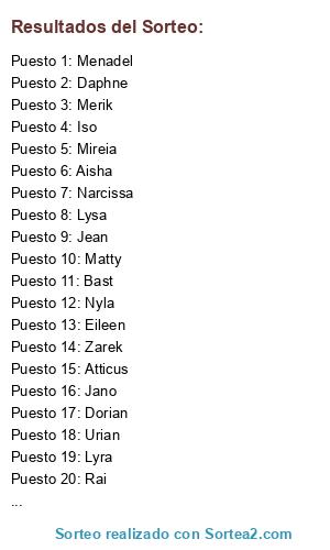 Lista de participantes: Siv, Aisha, Lysa, Zarek, Bast, Cam, Menadel, Jano, Jean, Daphne, Urian, Narcissa, Lyra, Rai, Merik, Matty, Dorian, Eileen, Nyla, Mireia, Iso, Atticus.
