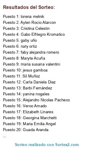 Lista de participantes: Noe Valdez(2 participaciones), Veroo Amado(2 participaciones), Noelia Belén Quintana(2 participaciones), Shannina Micaela De Francesco(2 participaciones), Mónica Neme(2 participaciones), Sil muñoz(2 participaciones), Barbi Fernández(2 participaciones), rene cardozo(2 participaciones), Laura Mendoza Colazo(2 participaciones), marcela alejandra padilla(2 participaciones), ro fabian(2 participaciones), Queña Cosas Muy Ricas(2 participaciones), mauro rios(2 participaciones), Sil Muñoz(2 participaciones), Veronica Gerbino(2 participaciones), gaby uño(2 participaciones), fer mussini(2 participaciones), mariela angelica(2 participaciones), Chechulina Zanganita(2 participaciones), Gabi Heredia(2 participaciones), belen vittar(2 participaciones), Cristina Celestin(2 participaciones), daniela emilce(2 participaciones), josefina mentesana(2 participaciones), monica perez(2 participaciones), Ivan Frzx Guanca(2 participaciones), Carii Ferreyra(2 participaciones), belu baigorria(2 participaciones), Silvina Sancho(2 participaciones), victoria rosas(2 participaciones), Guada Aranda(2 participaciones), sandry romero(2 participaciones), Mary Parraga(2 participaciones), Silvana Sanchez(2 participaciones), vero miranda(2 participaciones), Francisca Noelia Duarte(2 participaciones), Georgina Marchetti(2 participaciones), mika gonzalez(2 participaciones), Marcela Alejandra Padilla(2 participaciones), naty ortiz(2 participaciones), Gabo ElNegro Kromatico(2 participaciones), florencia molino(2 participaciones), Mechy Rodriguez(2 participaciones), Maryte Acuña(2 participaciones), lorena lopez gallego(2 participaciones), Marcelo Federico Padilla(2 participaciones), faby alejandra romero(2 participaciones), Ximena Alurralde(2 participaciones), Elizabeth Linares(2 participaciones), maria eugenia daher(2 participaciones), Irene Palacios(2 participaciones), jesus gamboa(2 participaciones), natalia benegas(2 participaciones), Carla Daniela Diaz(2 participaciones), carolina toledo(2 participaciones), lourdes chaneton(2 participaciones), Alejandro Nicolas Pacheco(2 participaciones), facundo lunda(2 participaciones), Majitoo Albiitaa(2 participaciones), duilio exequiel volo(2 participaciones), Maria Emilia Angel(2 participaciones), erica llanos diaz(2 participaciones), yanina nogales(2 participaciones), maria susana valentini(2 participaciones), Carolina Romero(2 participaciones), Aylen Rocio Alarcon(2 participaciones), clau miraza(2 participaciones), carla amun(2 participaciones), Norma Torrejon(2 participaciones), Lau Heredia(2 participaciones), pedro encinas(2 participaciones), Ivan Javier Mandiola Burgos(2 participaciones), lorena melnik(2 participaciones), andrea veronica(2 participaciones), Maira Belén Méndez(2 participaciones), Daniel Agustín Castro Ríos(2 participaciones), ana laura gradin(2 participaciones).
