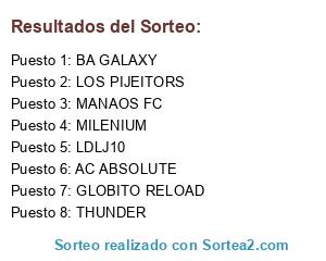 Lista de participantes: GLOBITO RELOAD, MILENIUM, LOS PIJEITORS, LDLJ10, MANAOS FC, AC ABSOLUTE, BA GALAXY, THUNDER.