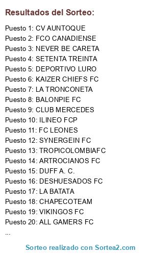 Lista de participantes: ALL GAMERS FC, ARTROCIANOS FC, BALONPIE FC, KAIZER CHIEFS FC, CLUB MERCEDES, CV AUNTOQUE, DESHUESADOS FC, DUFF A. C., FC LEONES, FCO CANADIENSE, ILINEO FCP, LA BATATA, LA TRONCONETA, MIDDLE HAIR FC, NEVER BE CARETA, POTRERO CLUB, QUESO Y DULCE, SETENTA TREINTA, SPORTIVO FLORES, SYNERGEIN FC, TROPICOLOMBIAFC, VIKINGOS FC, PCA ARGENTINA, CHAPECOTEAM, AC LATINOS, DEPORTIVO LURO.