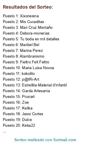 Lista de participantes: Rakel Bolitasworld(3 participaciones), Yolanda Pérez(3 participaciones), Miriam G(3 participaciones), Maria Luisa Novoa(3 participaciones), Alambranismo(3 participaciones), Xixonesina(3 participaciones), Fieltro Felt Feltro(3 participaciones), Mis Cucaditas(3 participaciones), Natalia(3 participaciones), Chiqui Beneytez(3 participaciones), Dulce(2 participaciones), Arte Friki(3 participaciones), Mara(3 participaciones), Isabel(2 participaciones), p@tRi-Art(3 participaciones), Eva Enfedque(2 participaciones), kokolito(3 participaciones), misdulceslocuras(2 participaciones), Susana Monedero(3 participaciones), Zoe(3 participaciones), Vane Sa(3 participaciones), Parupu(2 participaciones), Tu boda en mil detalles(3 participaciones), Iregumy(3 participaciones), Garda Artesania(3 participaciones), Kelika(3 participaciones), Sweet Dollies(2 participaciones), Xana(3 participaciones), Agarsa(2 participaciones), Liliana(2 participaciones), Kika la buena(3 participaciones), Sulema(2 participaciones), Carigelitas(3 participaciones), Prunart(3 participaciones), Eva Kiwi(2 participaciones), D Todo lo Demás(3 participaciones), Maribel Bel(3 participaciones), Bea y Cris(3 participaciones), Lolita Ladybug(2 participaciones), Ary(2 participaciones), Marikilla(3 participaciones), Analu(3 participaciones), Gloria Perez(2 participaciones), Tu toque original(3 participaciones), Las kukadas de Sandra(3 participaciones), hueleacoco(2 participaciones), Laura(2 participaciones), Jessi Cortes(3 participaciones), Marina Perez(3 participaciones), Debora-monerias(3 participaciones), Lunnaris(2 participaciones), Mari Cruz Montaño(3 participaciones), Mer QJ(2 participaciones), Lizzy Gomez(3 participaciones), Elanor, Mis ositos Ada(3 participaciones), María Ibañez(3 participaciones), El rincón de Vane(3 participaciones), Keka22(3 participaciones), todomanualidades(3 participaciones), Pizpiretta(2 participaciones), Estrellita-Material d’infantil(3 participaciones), HariRari(3 participaciones), Pupink(3 participaciones).