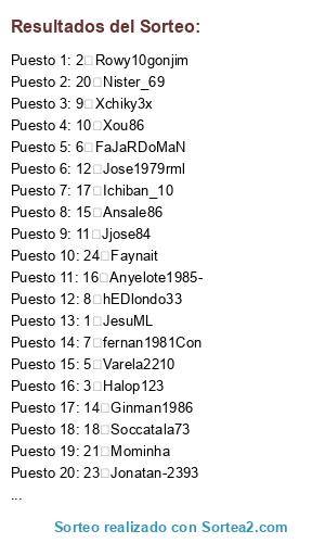 Lista de participantes: 1 JesuML, 2 Rowy10gonjim, 3 Halop123, 4 Eboy20, 5 Varela2210, 6 FaJaRDoMaN, 7 fernan1981Con, 8 hEDlondo33, 9 Xchiky3x, 10 Xou86, 11 Jjose84, 12 Jose1979rml, 13 aemepoam, 14 Ginman1986, 15 Ansale86, 16 Anyelote1985-, 17 Ichiban_10, 18 Soccatala73, 19 T_chico_T, 20 Nister_69, 21 Mominha, 22 Lethalprometius, 23 Jonatan-2393, 24 Faynait.
