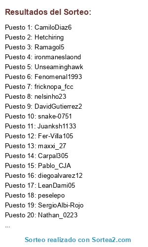 Lista de participantes: chevy_ _1992, Mariosofrv, fricknopa_fcc, camilo0512, Nacional110, X_Juankmfc_X, laujan1218, Garysnakeye, Bogotano18, DavidGutierrez2, Tinchomul, Lgrand10s, Carpal305, nelsinho23, maxxi_27, Juanse_aoki, Pepeasesino1, ElTumiPeru, stikjorJC17, Valcrist, PERUANOFORCE10, davidal1014, Botyz10, Fenomenal1993, onlysantew, Colombiannicko, Mateo_CFI, melendez_marco, Ricawoody14, FF-GERMAN, Jovanny1981, snake-075, snake-0751, Nathan_0223, peselepo, Hetchiring, DECANO_TORRES, Tu-muert3, jotalnator, Cfc_Zlatan, SergioAlbi-Rojo, matiasmarin2014, LM_Mafla_I9I, ironmaneslaond, cristhian_fistks, JAZON10FCB, Leodiaz_27, Axuby, Torettao-CFI, HND _ - Marcos - _ HND, o11ceCaldas, Lcharry79, LeanDami05, The_keane29, Ramagol5, torettoidag, XxfAlcoxX_, JavierOp915, flosanlopez17, adonko, Juanksh1133, Siiriiuus, joZeto_90, Cajf, JulianMB1986, Polaniar, CamiloDiaz6, YSIKSTBN24, JMpIx, Naluffy-D, JR-Palazzo, WillMolinag, Lokombia_27, diegoalvarez12, Andresmesa11, Unseaminghawk, Pablo_CJA, Yalexito7, Fer-Villa105, porritas.