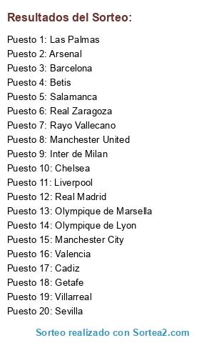 Lista de participantes: Salamanca, Betis, Arsenal, Cadiz, Real Zaragoza, Inter de Milan, Sevilla, Olympique de Lyon, Valencia, Getafe, Manchester City, Las Palmas, Liverpool, Barcelona, Chelsea, Manchester United, Olympique de Marsella, Villarreal, Rayo Vallecano, Real Madrid.