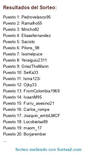 Lista de participantes: Egimendia99, J_murcia, Isma123i, Yeraiguiu2311, Furru_asesino21, Gysan_CLS, Mincho82, Ramalho55, Juangutierrez91, Facio7, Assasinstoto, GriezTheMann, Isra, Pelito10, Pedrovelasco95, maom_17, Ektor1991, Stewiedm27, IvaanM95, BorjaRT13, Sersol13, Aronsito86, Zysr4C29, Locobielsa89, Arovira9, Pelizelli, Collado93, Borjarember, Sacisto, Eliaasfernandez, Peppuz07, Carlos_rompe, Joaquin_embiLMCF, SeKa33, Isomelpuce, Ojky33, Pilons_98, Byronmixeleroney, FromColombia1969, Fer_man-87.