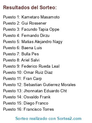 Lista de participantes: Facundo Tapia Oppe, Baena Luis, Francisco Torres, Matias Alejandro Nagy, Fran Carp, Jhonnatan Eduardo Cht, Gui Rossener, Federico Rueda Leal, Ariel Salvi, Diego Franco, Omar Ruiz Diaz, Sebastian Gutierrez Morales, Kametaro Masamoto, Bulla Pes, Osvaldo Frank, Fernando Dirzu.