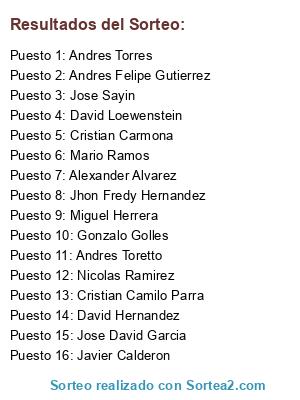 Lista de participantes: David Hernandez, Jhon Fredy Hernandez, Cristian Carmona, Andres Torres, Javier Calderon, Andres Felipe Gutierrez, Nicolas Ramirez, Mario Ramos, Jose David Garcia, Alexander Alvarez, David Loewenstein, Jose Sayin, Andres Toretto, Miguel Herrera, Cristian Camilo Parra, Gonzalo Golles.