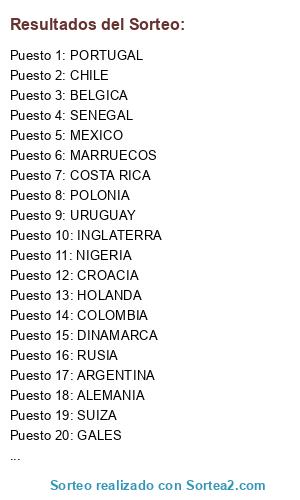 Lista de participantes: ALEMANIA, BELGICA, DINAMARCA, CROACIA, ESPAÑA, FRANCIA, GALES, INGLATERRA, ITALIA, HOLANDA, PORTUGAL, SUIZA, EGIPTO, MARRUECOS, NIGERIA, SENEGAL, MEXICO, COSTA RICA, ARGENTINA, BRASIL, CHILE, COLOMBIA, URUGUAY, RUSIA, POLONIA, ISLANDIA.